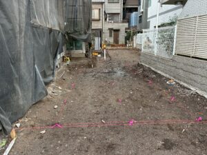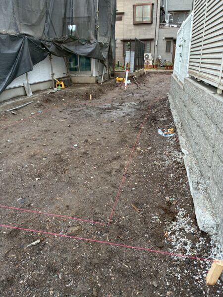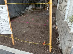配置図および地盤改良施工図に基づき、建物外周および地盤改良範囲の地縄張りを実施しました。